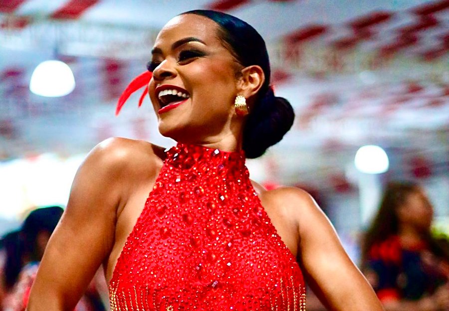 Logo ao chegar, a musa chamou a atenção pelo figurino marcante: um macaquinho vermelho com franjas, que valorizou ainda mais a silhueta da beldade e trouxe elegância, atitude e identidade à noite de ensaio. O look rendeu elogios e não passou despercebido pelos componentes e pelo público presente.